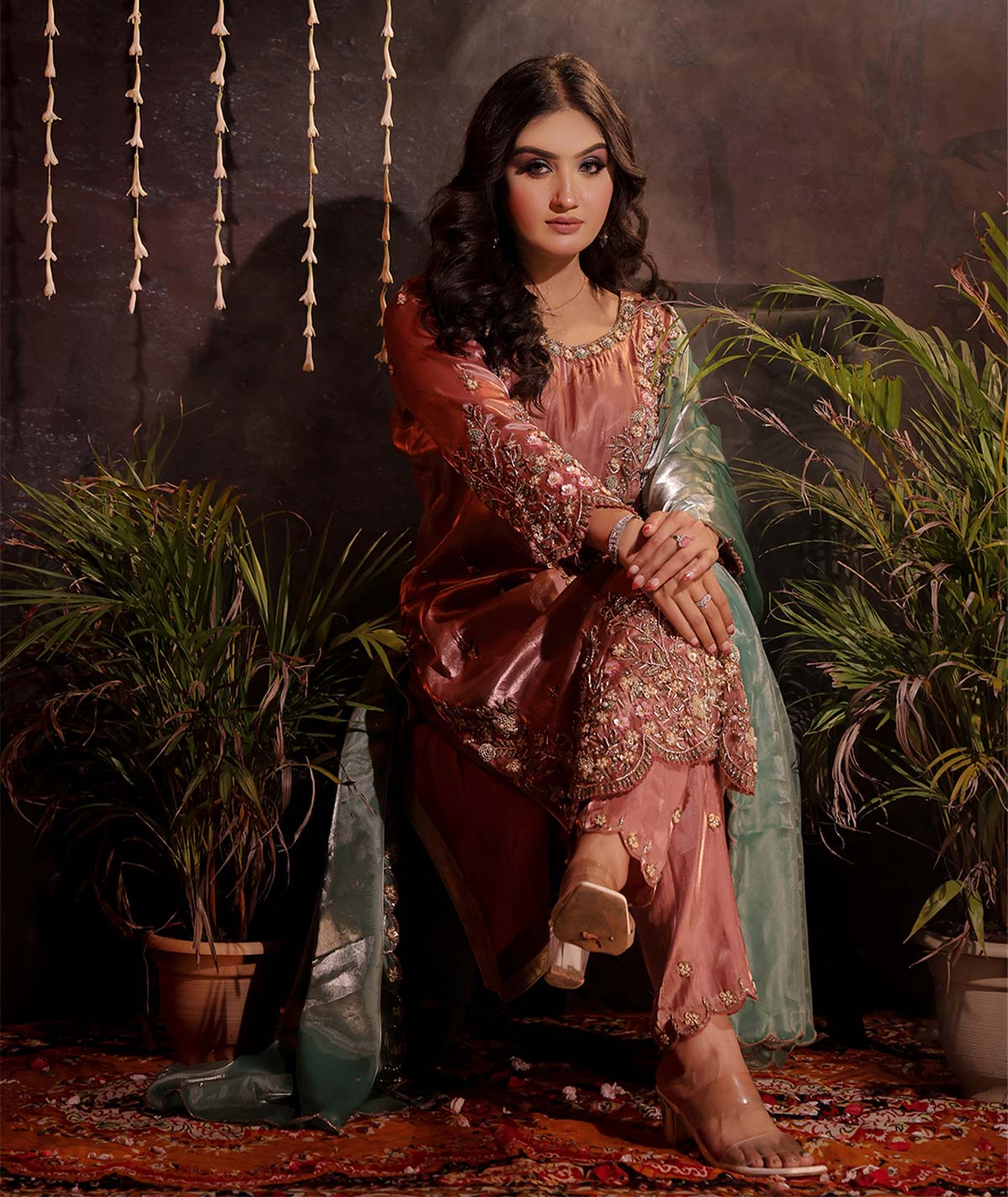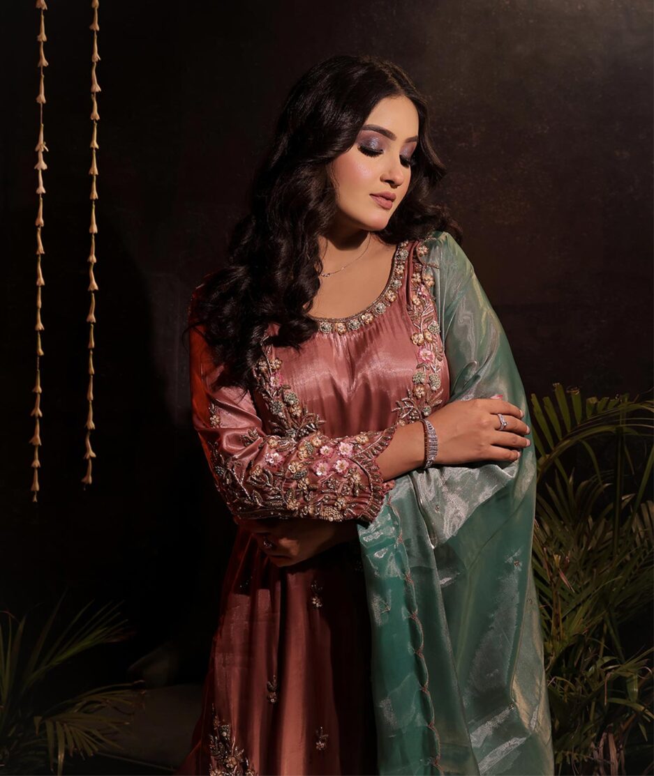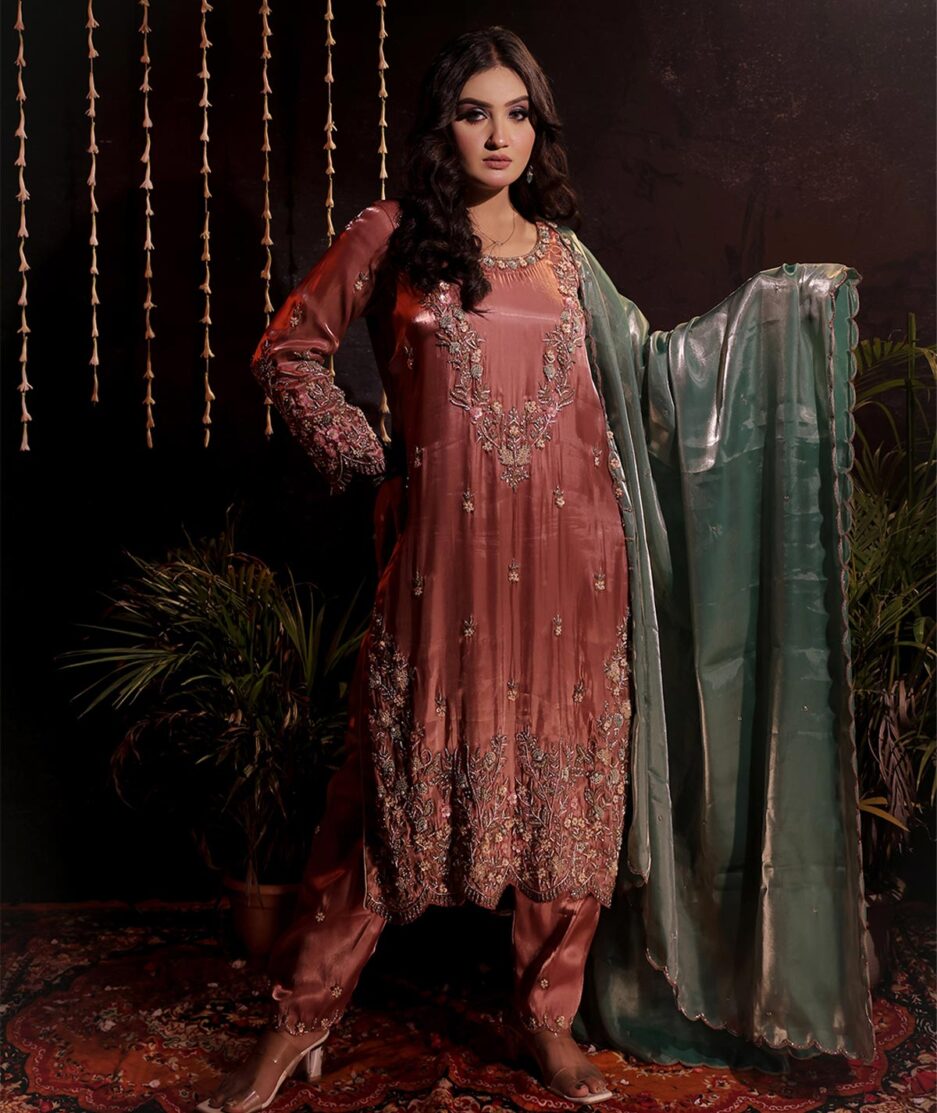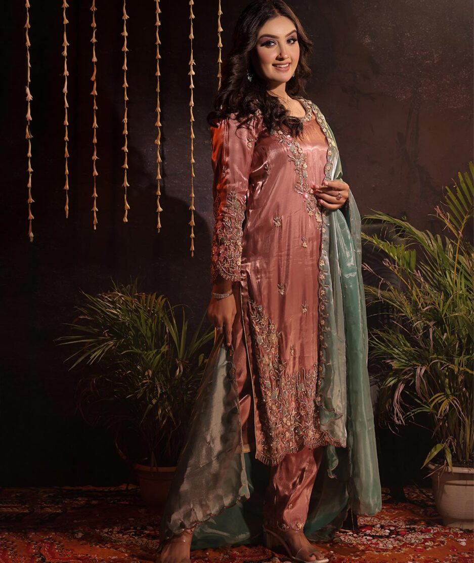 Party wear suit pant set in premium glass tissue fabric, fully handcrafted with intricate detailing. A luxurious blend of elegance and style, perfect for weddings, parties, and grand occasions.
