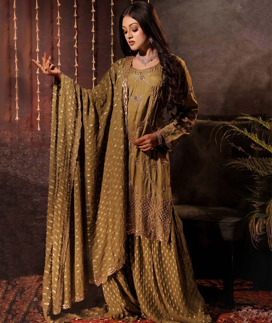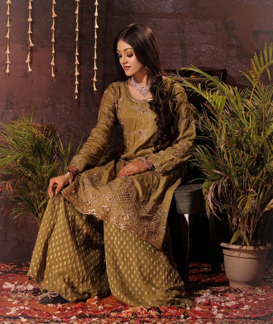 Traditional gharara suit set, crafted in premium fabrics with intricate cutwork details. A timeless blend of elegance and grace, perfect for festive celebrations and special occasions.